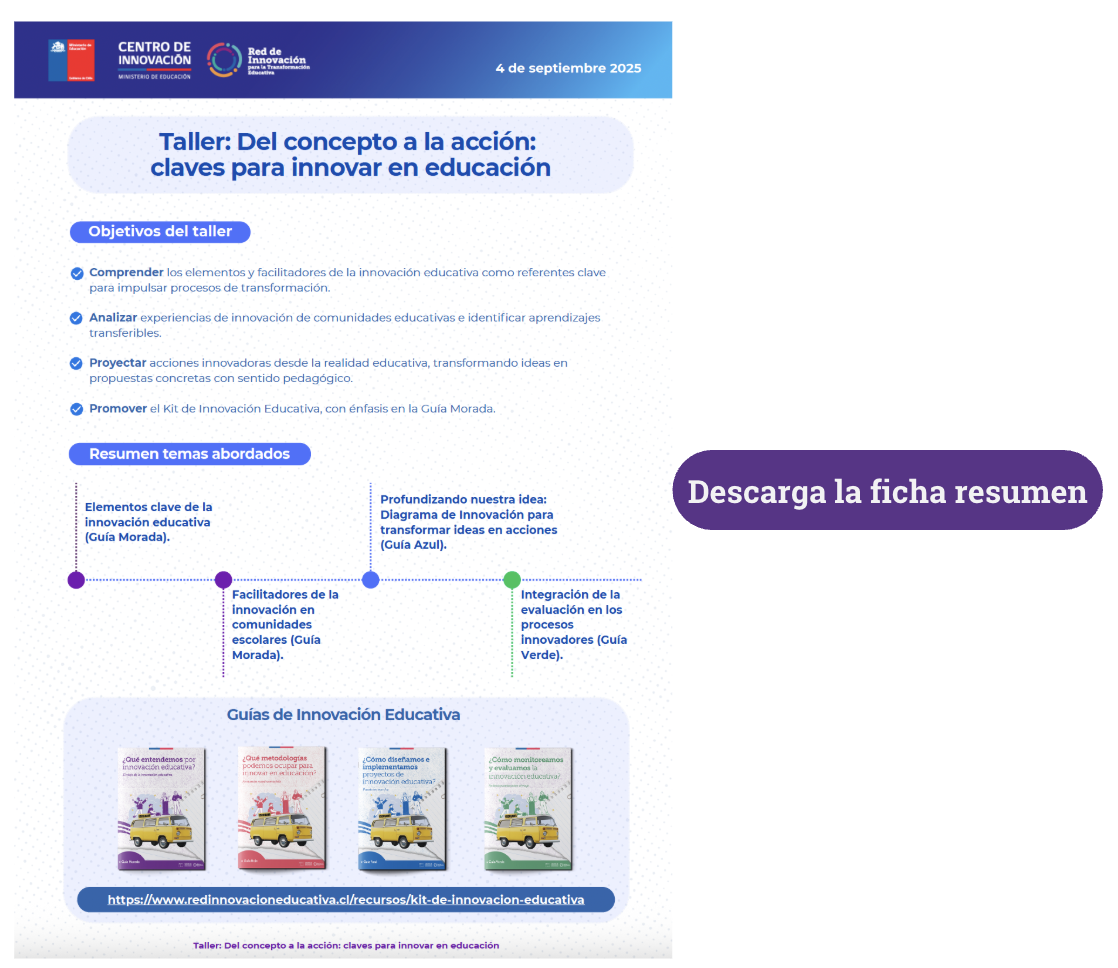 Este taller tuvo un especial énfasis en la Guía Morada: ¿Qué entendemos por innovación educativa? y cuenta con una ficha resumen descargable que sintetiza los principales contenidos y aprendizajes.